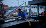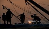 Buruh angkut beraktivitas di atas kapal di Pelabuhan Sunda Kelapa, Jakarta, Senin (15/5/2023). (FOTO : Republika/Thoudy Badai)