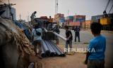 Buruh angkut mengangkat pipa untuk dinaikan ke kapal di Pelabuhan Sunda Kelapa, Jakarta, Senin (15/5/2023). (FOTO : Republika/Thoudy Badai)