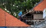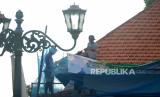 Pekerja mengerjakan proyek revitalisasi bangunan Sasana Hinggil Dwi Abad di Yogyakarta, Selasa (16/5/2023). (FOTO : Republika/Wihdan Hidayat)
