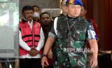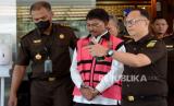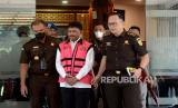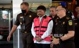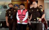 REPUBLIKA.CO.ID, JAKARTA -- Menteri Komunikasi dan Informatika (Menkominfo) Johnny G Plate mengenakan rompi tahanan usai menjalani pemeriksaan di gedung Jampidsus Kejaksaan Agung, Jakarta, Rabu (17/5/2023).