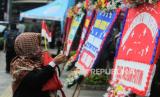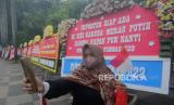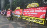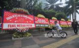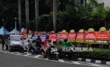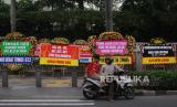 Sejumlah karangan bunga yang terpajang di kawasan Bundaran HI saat akan menyambut arak-arakan kontingen Indonesia pada Sea Games Kamboja di Jakarta, Jumat (19/5/2023). (FOTO : Republika/Putra M Akbar)