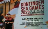 Menpora Dito Ariotedjo melepas kirab juara kontingen Sea Games 2023 di Halaman Gedung Kemenpora, Senayan, Jakarta, Jumat (19/5/2023).  (FOTO : Republika/Prayogi)