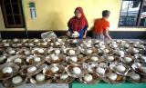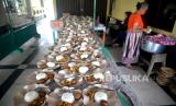 Ibu-ibu menyiapkan makanan nasi Jumat berkah untuk jamaah di Masjid Al Ikhlas Patukan, Gamping, Sleman, Yogyakarta, Jumat (19/5/2023). (FOTO : Republika/Wihdan Hidayat)