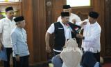 Pelaksana Harian (Plh) Wali Kota Bandung Ema Sumarna memasang rompi kepada salah satu petugas haji saat pelepasan secara simbolis calon jamaah haji (Calhaj) Kota Bandung tahun 2023, usai acara bimbingan calhaj, di Masjid Pusdai, Kota Bandung, Sabtu (20/5/2023). (FOTO : Edi Yusuf/Republika)