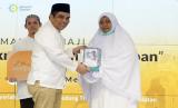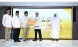 Direktur Sales & Distribution BSI Anton Sukarna (tengah) menyerahkan Kartu Debit Haji Indonesia kepada salah satu calon jemaah Haji Indonesia dari KBIH Al-Hasanah yang didampingi oleh Direktur Pengelolaan Dana Haji dan Sistem Informasi Haji Terpadu (Dirjen PHU) Kemenag Jaja Jaelani (kedua kiri) dan SVP Islamic Ecosystem BSI M. Syukron Habiby (kiri) di tengah acara Manasik Akbar yang digelar di The Tower, Jakarta, Sabtu (20/5/2023). Acara Manasik Akbar dengan peserta terbanyak dan diselenggarakan secara hybrid tersebut dilakukan dalam rangka menjelang keberangkatan Jemaah Haji Indonesia 1444 Hijriah/2023 Masehi. (FOTO : Dok Republika)