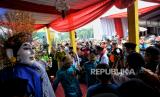 Warga menyaksikan pertunjukan kesenian betawi efoto saat mengunjungi acara Lebaran Betawi 1444 Hijriah di Lingkar Selatan Monumen Nasional (Monas), Jakarta, Ahad (21/5/2023). Pemerintah Provinsi DKI Jakarta kembali menggelar acara Lebaran Betawi setelah vakum selama 3 tahun akibat pandemi Covid-19. Lebaran Betawi kali ini mengusung tema Betawi Kompak, Jakarta Sukses, Indonesia Maju yang diisi dengan beragama kegiatan kesenian Betawi. Kegiatan tersebut berlangsung selama dua hari, dari tanggal 20-21 Mei 2023. (FOTO : Republika/Thoudy Badai)