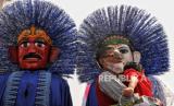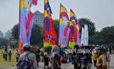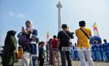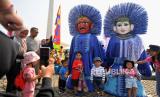 REPUBLIKA.CO.ID,JAKARTA -- Warga befoto bersama ondel-ondel saat mengunjungi acara Lebaran Betawi 1444 Hijriah di Lingkar Selatan Monumen Nasional (Monas), Jakarta, Ahad (21/5/2023).