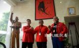 Sekjen PDI Perjuangan Hasto Kristiyanto (tengah) didampingi Ketua DPP bidang Kehormatan Komarudin Watubun (kanan) dan Wali Kota Solo Gibran Rakabuming Raka (kiri) berfoto usai menggelar pertemuan di Kantor DPP PDI Perjuangan, Jakarta, Senin (22/5/2023). (FOTO : Republika/Prayogi)