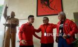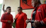 Sekjen PDI Perjuangan Hasto Kristiyanto (tengah) berbincang dengan Ketua DPP bidang Kehormatan Komarudin Watubun (kanan) dan Wali Kota Solo Gibran Rakabuming Raka (kiri) usai mengelar pertemuan di Kantor DPP PDI Perjuangan, Jakarta, Senin (22/5/2023). (FOTO : Republika/Prayogi)