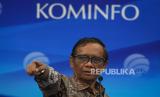 REPUBLIKA.CO.ID, JAKARTA -- Menko Polhukam sekaligus Plt Menkominfo Mahfud MD menyampaikan keterangan kepada wartawan dalam konferensi pers di kantor Kemenkominfo, Jakarta, Senin (22/5/2023).