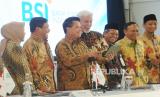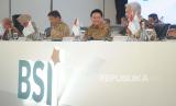 Direktur Utama Hery Gunardi (ketiga kiri) didampingi jajaran direksi dan komisaris berbincang saat akan digelar Rapat Umum Pemegang Saham Tahunan (RUPST) di Jakarta, Senin (22/5/2023). Rapat Umum Pemegang Saham Tahunan (RUPST) PT Bank Syariah Indonesia Tbk (BSI) menghasilkan komitmen untuk memperkuat transformasi digital dan culture.Pada RUPST tersebut, pemegang saham menyetujui untuk membagikan dividen tunai sebesar 10% dari laba bersih perseroan pada tahun 2022, atau sekitar Rp426.018.167.789,- yang ekuivalen dengan Rp9,24 per lembar saham. Kemudian, penggunaan 20 % laba bersih perseroan untuk tahun buku 2022 disisihkan sebagai cadangan wajib perseroan. Adapun 70 % akan dialokasikan sebagai laba ditahan.RUPST juga menetapkan pengurus baru perseroan, dengan memberhentikan dengan hormat Achmad Syafii sebagai Direktur Information Technology dan Tiwul Widyastuti sebagai Direktur Risk Management. (FOTO : Republika/ Tahta Aidilla)