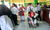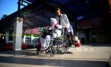 Jamaah calon haji kloter pertama dibantu petugas menuju lokasi pemeriksaan kesehatan di Asrama Haji Donohudan, Boyolali, Jawa Tengah, Selasa (23/5/2023). (FOTO : Republika/Wihdan Hidayat)