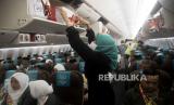 REPUBLIKA.CO.ID, TANGERANG -- Menteri Agama Yaqut Cholil Qoumas menyapa jamaah calon haji di dalam pesawat sebelum diberangkatkan ke Tanah Suci di Bandara Soekarno Hatta, Tangerang, Banten, Rabu (24/5/2023).