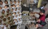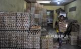 Pekerja menata telur ayam di salah satu sentra penjualan telur ayam di Jalan Ibrahim Adjie, Batununggal, Kota Bandung, Jawa Barat, Kamis (25/5/2023). (FOTO : ABDAN SYAKURA/REPUBLIKA)