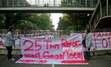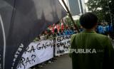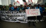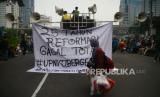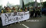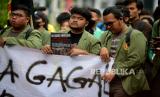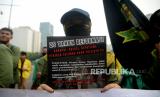 Mahasiswa membawa spanduk saat melakukan aksi peringatan 25 Tahun Reformasi di Kawasan Patung Kuda, Monas, Jakarta, Kamis (25/3/2023). Dalam aksi tersebut mereka mendesak pemerintah untuk segera wujudkan pendidikan gratis, menjamin kebebasan berekspresi, hapus korupsi, kolusi, nepostisme (KKN), tuntaskan kasus pelanggran HAM masa lalu dan Tolak UU cipta kerja. (FOTO : Republika/Prayogi)