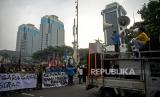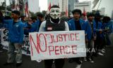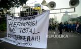 Sejumlah mahasiswa melakukan aksi peringatan 25 Tahun Reformasi di Kawasan Patung Kuda, Monas, Jakarta, Kamis (25/3/2023). Dalam aksi tersebut mereka mendesak pemerintah untuk segera wujudkan pendidikan gratis, menjamin kebebasan berekspresi, hapus korupsi, kolusi, nepostisme (KKN), tuntaskan kasus pelanggran HAM masa lalu dan Tolak UU cipta kerja. (FOTO : Republika/Prayogi)
