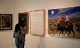 Pengunjung memotret lukisan dengan gawai saat pameran dalam rangka 25 Tahun Reformasi di Bentara Budaya Yogyakarta, Kamis (25/5/2023). Dalam pameran yang melibatkan 100 seniman dan perupa Yogyakarta ini digelar paralel di Yogyakarta dan Jakarta. Pameran yang bertajuk Kita Berteman Sudah Lama diniatkan sebagai perayaan persaudaraan, semangat kebersamaan, dan kebebasan berekspresi. (FOTO : Republika/Wihdan Hidayat)