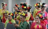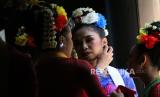 Para penari, mahasiswa jurusan tari Institut Seni Budaya (ISBI) Bandung bersiap mengikuti ujian akhir semester membawakan Tari Gaplek, di Gedung Pusat Pengembangan Kebudayaan (PPK), Kota Bandung, Kamis (25/5/2023). Tari Gaplek merupakan tarian tradisional asal Karawang yang biasa dipertunjukkan pasca panen tiba. Dengan kegiatan tersebut diharapkan kesenian tradisional tetap lestari dan dikenal oleh masyarakat. (FOTO : Edi Yusuf/Republika)