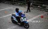 Warga membonceng anaknya pada bagian depan motor di kawasan Tebet, Jakarta, Kamis (25/5/2023). Membonceng anak pada bagian depan motor dinilai berbahaya karena rawan terpental ke depan apabila terjadi kecelakaan yang dapat membahayakan nyawa penumpang dan pengendara. (FOTO : Republika/Putra M. Akbar)