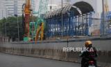 Pengendara motor melintas di dekat konstruksi Jembatan Penyeberangan Orang (JPO) yang sedang dalam tahap pembongkaran di Jalan Hayam Wuruk, Jakarta Pusat, Jumat (26/5/2023). Sebanyak empat JPO yang menghubungi Jalan Gajah Mada dan Jalan Hayam Wuruk dibongkar untuk persiapan pembangunan konstruksi MRT Jakarta CP202. JPO yang dibongkar yaitu, JPO Harmoni yang berada di depan Duta Merlin, JPO Harmoni di depan Bapeten, JPO Sawah Besar dan JPO Mangga Besar. (FOTO : Republika/Putra M. Akbar)