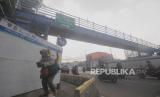 Petugas berjalan di dekat konstruksi Jembatan Penyeberangan Orang (JPO) yang sedang dalam tahap pembongkaran di Jalan Gajah Mada, Jakarta Pusat, Jumat (26/5/2023). Sebanyak empat JPO yang menghubungi Jalan Gajah Mada dan Jalan Hayam Wuruk dibongkar untuk persiapan pembangunan konstruksi MRT Jakarta CP202. JPO yang dibongkar yaitu, JPO Harmoni yang berada di depan Duta Merlin, JPO Harmoni di depan Bapeten, JPO Sawah Besar dan JPO Mangga Besar. (FOTO : Republika/Putra M. Akbar)
