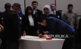 Ketua Umum PSSI Erick Thohir (kanan) menandatangani berita acara Pengukuhan dan Pelantikan Pengurus PSSI disaksikan Ketua KONI Pusat Marciano Norman (kiri) di Jakarta, Jumat (26/5/2023). KONI resmi melantik dan mengukuhkan 17 pengurus PSSI masa bakti 2023-2027. (FOTO : Republika/Putra M. Akbar)