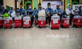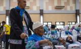 Calon jamaah haji kelompok terbang (kloter) pertama embarkasi Palembang antre untuk mendapatkan gelang identitas setibanya di Asrama Haji Palembang, Sumatera Selatan, Jumat (26/5/2023). Sebanyak 355 jamaah calon haji asal Kabupaten Ogan Komering Ulu (OKU) Timur tiba di Asrama Haji Palembang dan akan diterbangkan ke Tanah Suci pada Sabtu (27/5). (FOTO : Antara/Nova Wahyudi )