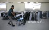 Petugas menyiapkan kursi roda untuk calon jamaah haji di Embarkasi Kertajati, Indramayu, Jawa Barat, Jumat (26/5/2023). Kantor Wilayah Kementerian Agama Provinsi Jawa Barat mulai menyiapkan sarana dan kebutuhan logistik lain bagi 8.350 Jamaah calon haji yang akan masuk ke asrama haji Embarkasi Kertajati pada 27 Mei 2023. (FOTO : Antara/Dedhez Anggara)