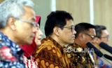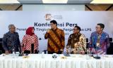 Ketua Dewan Komisioner LPS Purbaya Yudhi Sadewa (tengah) didampingi (dari kiri): Priyanto Budi Nugroho, Direktur Eksekutif; Lana Soelistianingsih, Kepala Eksekutif: Didik Madiyono, Anggota Komisioner; dan Dimas Yuliharto, Sekretaris Lembaga saat menggelar Konferensi Pers terkait Rapat Dewan Komisioner (RDK) Lembaga Penjamin Simpanan (LPS) di Jakarta, Jumat (26)5/2023). Dijelaskan oleh Purbaya Yudhi Sadewa, LPS telah melakukan evaluasi dan memutuskan untuk mempertahankan TBP simpanan Rupiah di bank umum dan BPR masing-masing sebesar 4,25 % pada bank umum dan 6,75 % pada BPR. Untuk TBP simpanan valuta asing (valas) pada bank umum sebesar 2.25 % dan berlaku pada periode 1 Juni 2023 sampai 30 September 2023. Hal ini dilakukan menjaga momentum pemulihan ekonomi yang berkelanjutan dan upaya menjaga stabilitas sistem keuangan. (FOTO : Dok Republika)