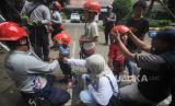 Anak-anak memakai alat pengaman saat akan bermain flying fox pada acara Lebaran Tenabang 2023 di Jalan KH Mas Mansyur, Tanah Abang, Jakarta, Sabtu (27/5/2023). Acara tersebut merupakan ajang silaturahim tahunan warga Tanah Abang dengan menampilkan beragam kebudayaan khas betawi yang berlangsung selama satu hari penuh. (FOTO : Republika/Putra M. Akbar)