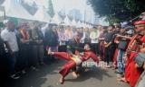 Pesilat menampilkan atraksi palang pintu pada acara Lebaran Tenabang 2023 di Jalan KH Mas Mansyur, Tanah Abang, Jakarta, Sabtu (27/5/2023). Acara tersebut merupakan ajang silaturahim tahunan warga Tanah Abang dengan menampilkan beragam kebudayaan khas betawi yang berlangsung selama satu hari penuh. (FOTO : Republika/Putra M. Akbar)