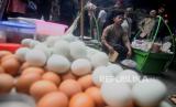 Pedagang kerak telor berjualan pada acara Lebaran Tenabang 2023 di Jalan KH Mas Mansyur, Tanah Abang, Jakarta, Sabtu (27/5/2023). Acara tersebut merupakan ajang silaturahim tahunan warga Tanah Abang dengan menampilkan beragam kebudayaan khas betawi yang berlangsung selama satu hari penuh. (FOTO : Republika/Putra M. Akbar)