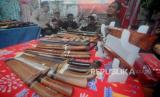 Golok yang dijual pada acara Lebaran Tenabang 2023 di Jalan KH Mas Mansyur, Tanah Abang, Jakarta, Sabtu (27/5/2023). Acara tersebut merupakan ajang silaturahim tahunan warga Tanah Abang dengan menampilkan beragam kebudayaan khas betawi yang berlangsung selama satu hari penuh. (FOTO : Republika/Putra M. Akbar)