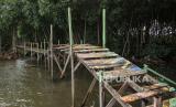 Kondisi jembatan di Ekowisata Mangrove Rara yang lapuk di Desa Balang Baru, Kabupaten Jeneponto, Sulawesi Selatan, Sabtu (27/5/2023). Ekowisata mangrove yang diresmikan pada Januari 2019 tersebut terbengkalai dan semua fasilitas wisata di dalam hutan bakau tersebut rusak sehingga dapat membahayakan pengunjung.   (FOTO :  Antara/Arnas Padda)