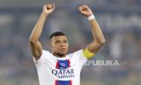 Pemain Paris Saint-Germain (PSG)Kylian Mbappe melakukan selebrasi setelah pertandingan sepak bola Liga Satu Prancis antara Strasbourg dan Paris Saint Germain di stadion Stade de la Meinau di Strasbourg, Prancis timur, Ahad (10/5/22023). (FOTO : AP)
