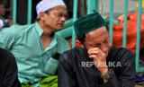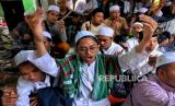 Jamaah menangis saat mengumandangkan shalawat dalam acara Haul ke-10 Al Habib Munzir bin Fuad Almusawa, Rawajati, Pancoran, Jakarta Selatan, Ahad (28/5/2023). (FOTO : Republika/Thoudy Badai)