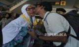 Seorang calon haji kloter 10 Embarkasi Makassar berpamitan kepada keluarganya sebelum menuju ruang tunggu keberangkatan di Bandara Sultan Babullah Ternate, Kota Ternate, Maluku Utara, Senin (29/5/2023). Sebanyak 1.076 jamaah calon haji asal  Maluku Utara diberangkatkan menuju Tanah Suci melalui Bandara Internasional Hasanuddin Makassar dan melanjutkan perjalan menuju Madinah pada 30 Mei 2023.   (FOTO :  Antara/Andri Saputra )