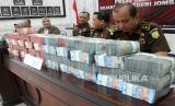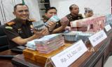 REPUBLIKA.CO.ID,JOMBANG -- Kepala Kejaksaan Negeri Jombang Tengku Firdaus (kiri) dan jajarannya menunjukkan barang bukti uang hasil korupsi di Kejari Kabupaten Jombang, Jawa Timur, Senin (29/5/2023).