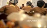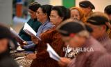 Peserta menyimak tembang Macapat saat Gelar Budaya Macapat di Taman Pintar, Yogyakarta, Senin (29/5/2023). Sebanyak 200 pelestari sastra lokal macapat mengikuti Macapat Teteg Tatag Tutug dalam rangka HUT ke-76 Pemerintah Kota Yogyakarta. Peserta yang ikut wajib menggunakan pakaian Gagarak Ngayogyakarta. Tujuan acara yang digelar selama tiga hari ini merupakan bentuk kepedulian, pembinaan serta pelestarian budaya macapat. (FOTO : Republika/Wihdan Hidayat)