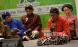 Beberapa peserta menggunakan pakaian Gagrak Ngayogyakarta menyimak tembang Macapat saat Gelar Budaya Macapat di Taman Pintar, Yogyakarta, Senin (29/5/2023). Sebanyak 200 pelestari sastra lokal macapat mengikuti Macapat Teteg Tatag Tutug dalam rangka HUT ke-76 Pemerintah Kota Yogyakarta. Peserta yang ikut wajib menggunakan pakaian Gagarak Ngayogyakarta. Tujuan acara yang digelar selama tiga hari ini merupakan bentuk kepedulian, pembinaan serta pelestarian budaya macapat. (FOTO : Republika/Wihdan Hidayat)