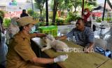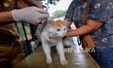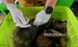 Petugas dari Suku Dinas Ketahanan Pangan, Kelautan dan Pertaniaan (KPKP) Jakarta Selatan menyuntikan vaksin rabies kepada hewan peliharaan warga di RPTRA Asoka, Jakarta, Selasa (30/5/2023). Sudin KPKP menggelar vaksinasi rabies secara rutin setiap bulan di seluruh Kecamatan di Pasar Minggu dengan jumlah kuota vaksin perlokasi sebanyak 150 vaksin. Hewan peliharaan yang bisa divaksin rabies yakni kucing, anjing, kera dan musang. (FOTO : Republika/Thoudy Badai)