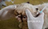 Petugas dari Suku Dinas Ketahanan Pangan, Kelautan dan Pertaniaan (KPKP) Jakarta Selatan menyuntikan vaksin rabies kepada hewan peliharaan warga di RPTRA Asoka, Jakarta, Selasa (30/5/2023). Sudin KPKP menggelar vaksinasi rabies secara rutin setiap bulan di seluruh Kecamatan di Jakarta Selatan, dengan jumlah kuota vaksin perlokasi sebanyak 150 vaksin. Hewan peliharaan yang bisa divaksin rabies yakni kucing, anjing, kera dan musang. (FOTO : Republika/Thoudy Badai)