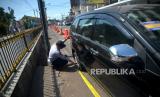 Petugas mengempiskan ban mobil yang parkir sembarangan di marka biku-biku Jalan Pasar Kembang, Yogyakarta, Selasa (30/5/2023). Penertiban parkir liar di Jalan Pasar Kembang dilakukan petugas gabungan Satlantas Polresta Yogyakarta, Dishub Kota Yogyakarta, dan Satpol PP Kota Yogyakarta. Hal ini dilakukan untuk keselamatan dan kenyamanan berlalu-lintas di area wisata. Selain itu, juga banyaknya kendaraan yang berhenti serta parkir liar saat sore dan malam. Untuk mengantisipasi petugas memasang water barrier dan pita larangan melintas sepanjang 400 meter di Jalan Pasar Kembang. (FOTO : Republika/Wihdan Hidayat)