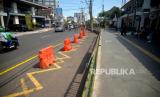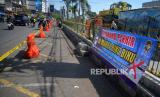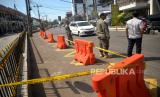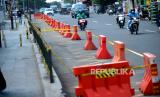 REPUBLIKA.CO.ID,YOGYAKARTA -- Water barrier dan pita larangan melintas terpasang di marka biku-biku Jalan Pasar Kembang, Yogyakarta, Selasa (30/5/2023).