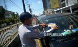 Petugas menempelkan stiker pelanggaran parkir pada kaca mobil yang parkir sembarangan di marka biku-biku Jalan Pasar Kembang, Yogyakarta, Selasa (30/5/2023). Penertiban parkir liar di Jalan Pasar Kembang dilakukan petugas gabungan Satlantas Polresta Yogyakarta, Dishub Kota Yogyakarta, dan Satpol PP Kota Yogyakarta. Hal ini dilakukan untuk keselamatan dan kenyamanan berlalu-lintas di area wisata. Selain itu, juga banyaknya kendaraan yang berhenti serta parkir liar saat sore dan malam. Untuk mengantisipasi petugas memasang water barrier dan pita larangan melintas sepanjang 400 meter di Jalan Pasar Kembang. (FOTO : Republika/Wihdan Hidayat)