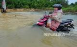 Pengendara sepeda motor menerobos jalan yang terendam banjir di Kenali Asam Atas, Kota Baru, Jambi, Selasa (30/5/2023). Banjir yang terjadi akibat kurang berfungsinya sistem drainase setelah kota itu dilanda hujan deras sekitar tiga jam pada Selasa (30/5) dini hari mengakibatkan sejumlah ruas jalan terendam hingga ketinggian 60 cm. (FOTO : Antara/Wahdi Septiawan )