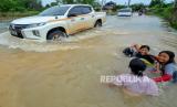REPUBLIKA.CO.ID,JAMBI -- Sejumlah bocah bermain air di dekat kendaraan yang menerobos jalan yang terendam banjir di Kenali Asam Atas, Kota Baru, Jambi, Selasa (30/5/2023).