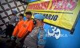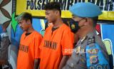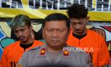 REPUBLIKA.CO.ID,YOGYAKARTA -- Tersangka Reno dan Rizky dihadirkan saat gelar perkara kejahatan geng remaja di Polsek Umbulharjo, Yogyakarta, Selasa (30/5/2023).