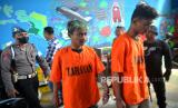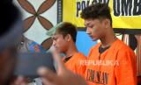 Tersangka Reno (kiri) dan Rizky dihadirkan saat gelar perkara kejahatan geng remaja di Polsek Umbulharjo, Yogyakarta, Selasa (30/5/2023). Polsek Umbulharjo mengamankan enam tersangka dari Geng Vascal dan empat diantaranya masih di bawah umur sehingga tidak dihadirkan saat gelar kasus. Sedangkan untuk ketuanya yakni Reno merupakan residivis untuk kasus yang serupa. Para pelaku dijerat pasal yang berbeda, Reno dijerat Pasal 304 KUHP, Rizky dijerat Pasal 137 KUHP subsider Pasal 351 KUHP atau Pasal 368 KUHP. Sedangkan untuk empat tersangka lainya dijerat dengan Pasal 80 Jo 76C UU RI/ 2014 tentang perubahan UU RI Nomer 23/ 20022. (FOTO : Republika/Wihdan Hidayat)