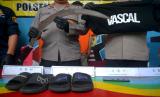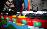 Barang bukti ditampilkan yang digunakan saat gelar perkara kejahatan geng remaja di Polsek Umbulharjo, Yogyakarta, Selasa (30/5/2023). Polsek Umbulharjo mengamankan enam tersangka dari Geng Vascal dan empat diantaranya masih di bawah umur sehingga tidak dihadirkan saat gelar kasus. Sedangkan untuk ketuanya yakni Reno merupakan residivis untuk kasus yang serupa. Para pelaku dijerat pasal yang berbeda, Reno dijerat Pasal 304 KUHP, Rizky dijerat Pasal 137 KUHP subsider Pasal 351 KUHP atau Pasal 368 KUHP. Sedangkan untuk empat tersangka lainya dijerat dengan Pasal 80 Jo 76C UU RI/ 2014 tentang perubahan UU RI Nomer 23/ 20022. (FOTO : Republika/Wihdan Hidayat)